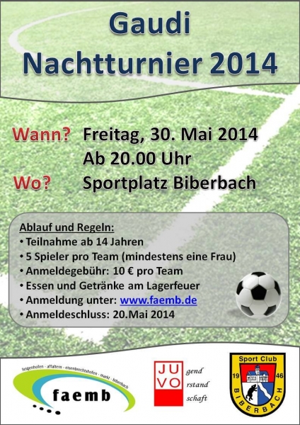 Mittlerweile schon traditionell veranstalteten das Biberbacher Jugendforum FAEMB und die Jugendvorstandschaft des SC Biberbach im Frühjahr ein Gaudi Nachtturnier auf dem Sportplatz am Galgenberg. Ein Highlight für Fußballfreunde aus Nah und Fern, die einmal ganz ohne Leistungsdruck gegen das runde Leder treten möchten.