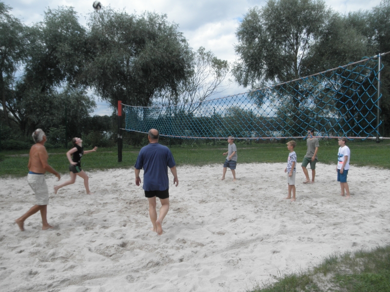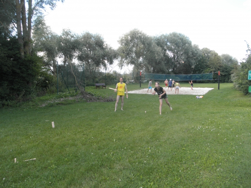 Neben dem Sandfeld auf unserem Beachvolleyballplatz finden auch Spiele auf einem Rasenfeld statt, um einen optimalen Ablauf des Turniers zu garantieren.