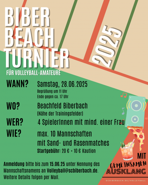 Das 5. BiberBEACH Turnier findet dieses Jahr für alle volleyballbegeisterten Amateuer am 28.06.2025 statt. Biberbacher Vereine werden bevorzugt, aber auch auswärtige Mannschaften sind willkommen.